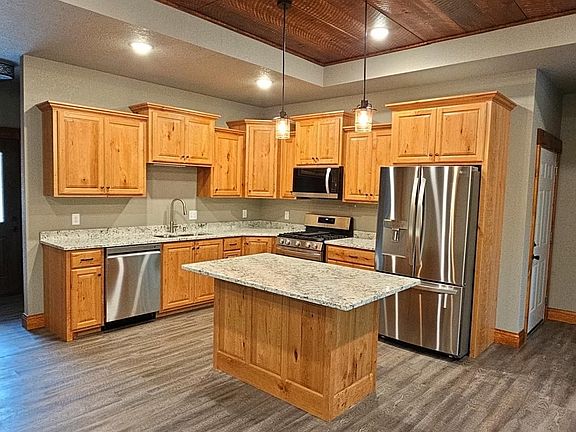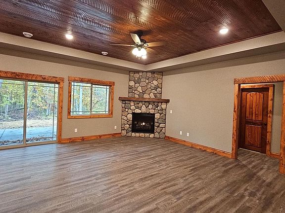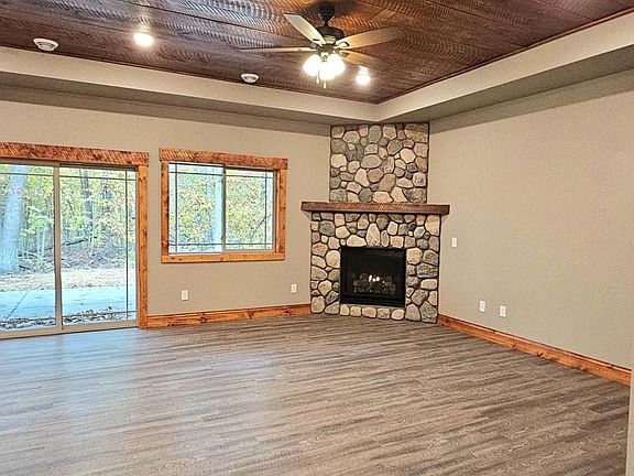 Must see this beautiful new construction built by Traut Homes. Home situated on a 1+ acre wooded lot with black top driveway and freshly seeded yard. This open floor plan has 4 bedrooms, 2 bathrooms and everything on one level. The spacious owners suite gives you much privacy being separated from rest of home.. Owner suite features double handmade white pine custom closet doors, pine tray ceiling, private bathroom with double sinks, gorgeous tile work in the lighted shower. Other home features include granite counter tops, cherry wood kitchen cabinets, a stunning stone gas fireplace in the corner with a wood block mantle, custom woodwork/doors thru out, recess lighting, central air, breakfast bar, a walk-in front entry closet, covered back yard patio, stainless steel LG appliances, natural gas, a finished heated/insulated 3 car garage with floor drain and so much more. You will love everything about this home!!