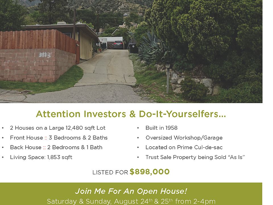 This is a rare opportunity to purchase two houses on one large lot. Just imagine the things you can do with a fixer upper property like this. Bring your remodel ideas and make this property a great investment or a private retreat. You can live in the back two bedroom, one bath house while you fix up the front three bedroom, two bath house. Behind the back house there is even a large grassy area so why not add a pool! You'll appreciate the over-sized, two-car garage and long driveway for all yourvehicles and toys. This prime piece of property is located in the County area of La Crescenta. It's up in the hills on a cul-de-sac in a highly desirable Blue Ribbon School District, only minutes to Montrose, Old Town Pasadena, Burbank and downtown Los Angeles.2 Houses on a Large LotLot Size: 12,480 sqftFront House: 3 Bedrooms & 2 BathsBack House: 2 Bedrooms & 1 BathLiving Space: 1,853 sqftBuilt in 1958Oversized Workshop/GarageLocated on Prime Cul-de-sacTrust Sale Property Being Sold ''As Is''