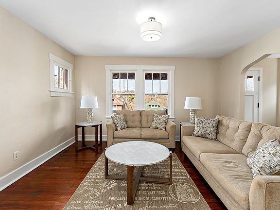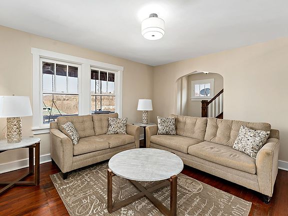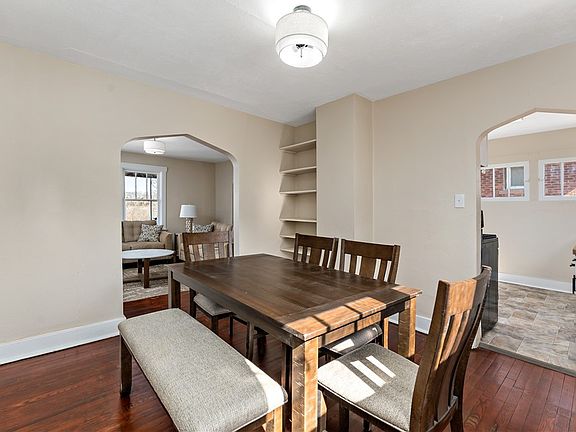 Move-in ready home filled with charming details! The bright and open living room seamlessly flows into a spacious dining room with built-in shelving. The updated kitchen features butcher block countertops and stainless steel appliances. Refinished hardwood floors run throughout the home, complemented by a beautiful wood staircase. Upstairs, you'll find three generous bedrooms and a beautifully updated full bathroom. Trim, window molding, and doors have been updated throughout. The large basement offers a laundry area and additional storage/cellar space. Enjoy outdoor living with a covered front porch and a back patio area. Plus, two off-street parking spaces in the rear provide added convenience!