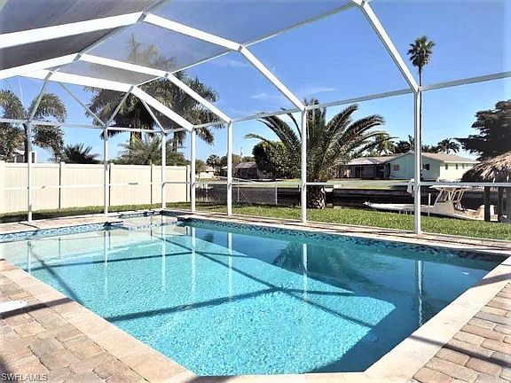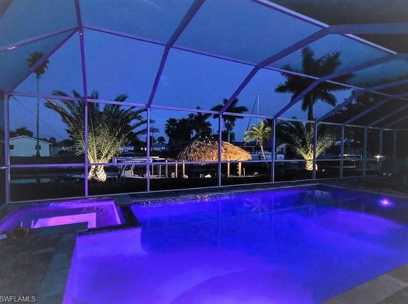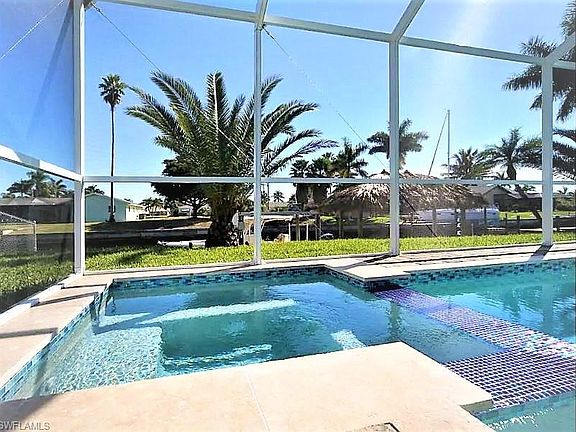 DIRECT GULF ACCESS - NO BRIDGES!!*** Two minutes to the Caloosahatchee River. This beautiful home has had a complete overhaul and is simply gorgeous! Major reno 2017, new roof 2016, newer AC, heated pool and spa 2017, new flooring, granite and bathrooms. Three spacious bedrooms, all with engineered wood flooring, updated bathrooms with travertine tile and all new counters and showers. Kitchen is open to the great room with lots of cabinet space, lots of light, granite and a beautiful view of the pool and the canal. Outside is a DREAM - 7,000 pound boat lift, tiki hut, outdoor dock, beautiful lush landscape and don't forget the oversized pool with jacuzzi, LED lighting and heated as well. Plenty of outdoor covered lanai space. Lots of extra details. This home has been part of a very successful vacation rental program and has plenty of bookings. Seller will consider selling turn key with the right price.