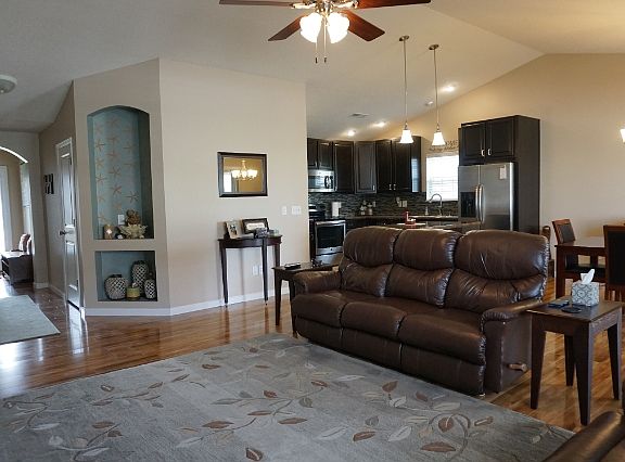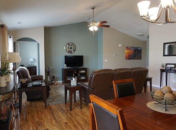 Exceptional quality is what you will find in this 3 bedroom home in the well desired Ashland Park Subdivision. Beautiful landscaping will attract you to the front of the home. The arched entryway and cathedral ceilings lead you into the home. Gleaming wood laminate flooring flows through the open living room, dining room and kitchen along with great lighting and accented cut outs in the living room. Stainless steel appliances, rich dark wood cabinets, tile backsplash and a breakfast bar show off the kitchen. The mater bedroom host a walk-in closet and full bath. Entertaining is made easy in the lovely fenced backyard. The covered patio has a poured foundation for future expansion. Upgraded furnace and hot water heater have been installed. This is a great home.