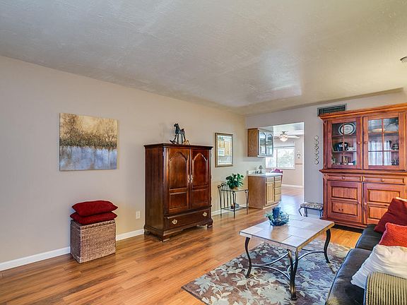 Cute well cared for home in perfect location. 4 Bedrooms 2 baths Enter into spacious Living room with laminate wood floors. Large eat in kitchen with a ton of cabinets, built on microwave, window over sink looking onto patio, all open to family room. Master suite with custom built in dresser/desk, private exit and walk in closet. Backyard with extensive covered patio. 2 car garage with cabinets