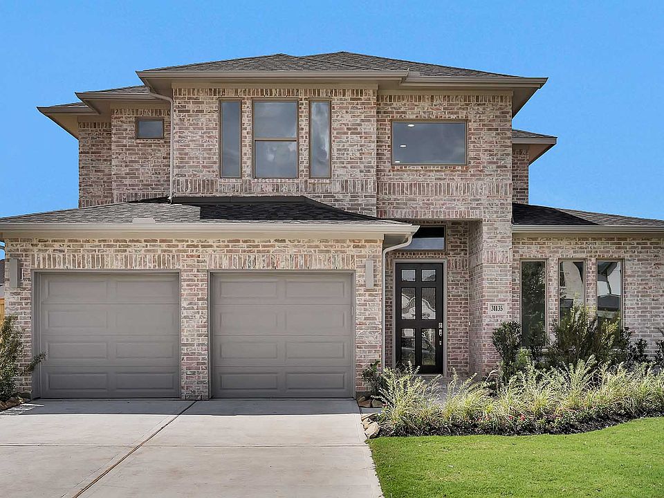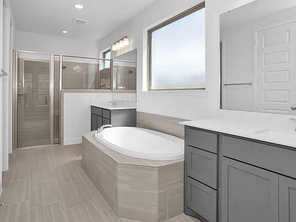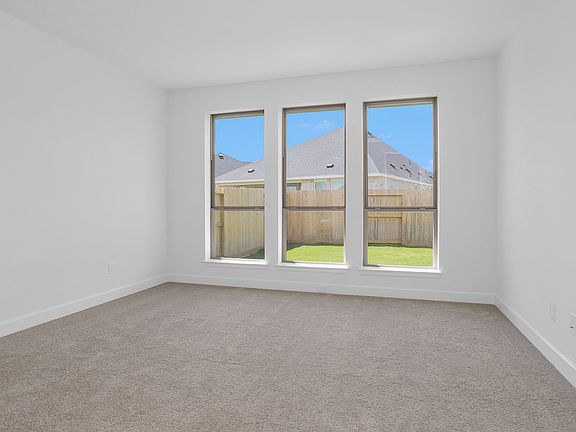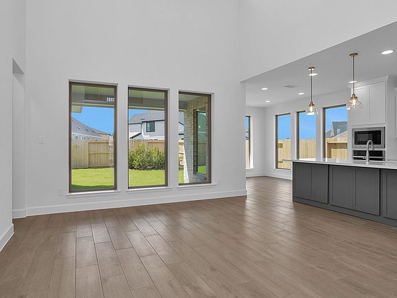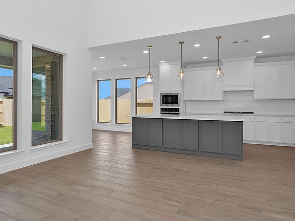 Front porch opens into a two-story entryway with a grand staircase. French doors enclose the private home office. The utility room is conveniently located off the main hallway. The family room boasts extended ceilings and a wall of windows. The kitchen has an island with built-in seating, 5-burner gas cooktop and a walk-in pantry. The dining area is embraced by a corner wall of windows and allows entrance into the covered backyard patio. The primary bedroom boasts three large windows. French doors open into the primary bathroom which hosts dual vanities, a garden tub, glass enclosed shower, and two walk-in closets. Upstairs you are welcomed by a game room and secondary bedrooms. Completing the home is a guest suite tucked beyond the mud room which features a full bathroom. Two-car garage. Representative Images. Features and specifications may vary by community.