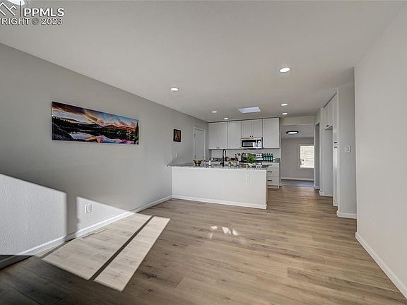 This 1820- sq ft ranch style home has been completely renovated and offers 4 bedrooms, 2 bathroom, 1-car garage and an extended view of the beautiful Colorado mountain range. This home is located in the Smartt subdivision near North Circle Drive and Palmer Park Blvd with no HOA’s. The exterior has been updated with new paint, windows and a minimal xeriscape lawn for easy maintenance and reduced need for irrigation. This home features an updated kitchen with new cabinet, granite countertops, stainless-steel appliances, and even has a skylight. The natural lighting reflects off the neutral color palette throughout the main level adding a spacious and bright feel. Three bedrooms and one bathroom are on the main level, with an oversized living room on the backend of the home. This living room area has two large windows, and a double sliding glass door leading out to the backyard- beams of natural lighting. The basement entrance is off the kitchen, the basement has one bedroom and one bathroom, family room and a large laundry room. Must see- come check out the view! Improvements include: New windows, paint, laminate flooring, tile, kitchen cabinets, granite counters, plumbing fixtures, electrical fixtures, carpet