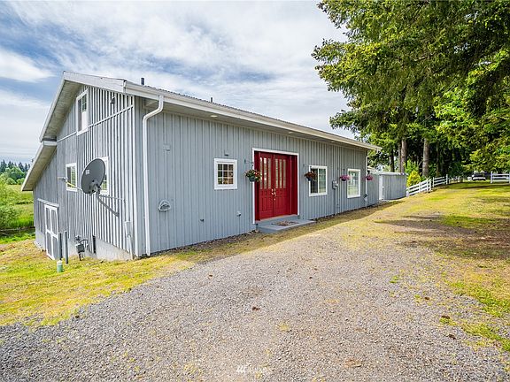 Incredibly rare modern farm house on acreage! This 1600 sqft home features cathedral ceilings w/beautifully exposed trusses, Dewils custom cabinets, quartz countertops, SS appliances, custom blinds & an open light-filled floor plan - a perfect mix of the modern&rustic styles. Several upgrades throughout The main level flows to a large deck with exceptional views. Underneath the home is large basement stretching 80ft long. Attached to the home is a massive enclosed overhang with 4 deep stalls, that could be used as a shop. Master suite on the main. Prominently positioned on a 5 acre lot w/mountain view, pond & golf course views. Part of the property is adjacent to the Newakum Golf Course. Property has potential to be a commercial investment.