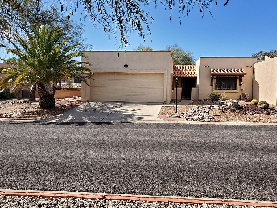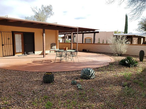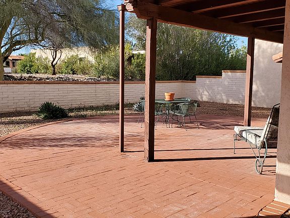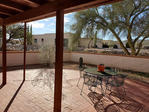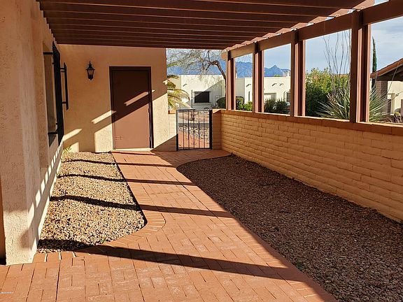Great Property! Gently lived in, 2BR/2BA boasts a large, walled in, back yard with a covered porch and a pergola all along the south side keeping this end unit town home comfortable all year long. Nice finishes & upgrades over the years like the beautiful solid wood front door w/stained glass, Continental Design window shades, real wood floors, Kenmore dbl wall ovens, Whirlpool Gold stainless ref & washer/dryer set, and Bryant heat pump. Convenient built-in desk by the breakfast nook. Abundant storage with a coat, pantry, huge linen, walk-in master, more closets in the 2 car garage plus the possibility of resurrecting the golf cart garage or turn it into a workshop. Spotless garage! Guest parking a couple doors north. Desert Hills & Canoa rec centers just minutes away. All the furniture