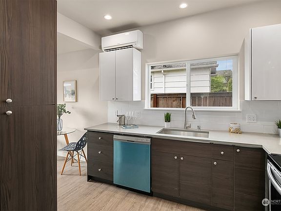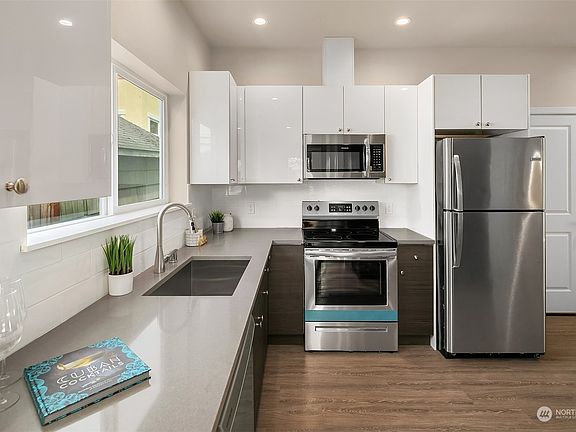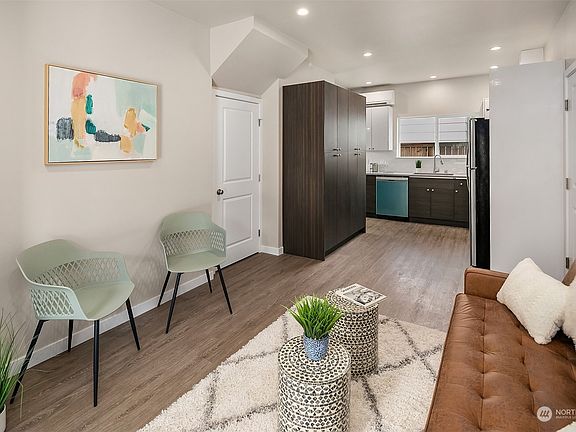 Unique condo in the Roxhill community of Seattle. Stylishly remodeled 1 bed, 1.5 bath stand-alone unit with attached, oversized garage and workshop. Enter into the open concept living area with half bath, chef’s kitchen, eating area, and access to your private, fenced side yard. Head upstairs to the spacious primary bedroom with its beautifully finished en-suite full bath. This property has been updated with LVP flooring and attractive finishes throughout. Convenient to amenities and freeways.