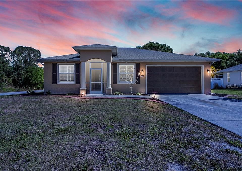 Beautiful 3 bedroom, 2 bathroom home on an oversized corner lot in North Port awaits new owners! This well maintained home has a thoughtful layout, with both a formal dining and living room at the front of the home, connected to the kitchen with stainless steel appliances and a new refrigerator, with breakfast bar, open to the family room. Off to the left side, the master suite awaits, with his/hers closets, private lanai access, and a large bathroom with dual vanities and lovely appointments. On the opposite side of the kitchen, 2 guest bedrooms with great light and closet space are perfect for guests, with an updated shared bathroom. Also, the inside laundry connects the garage to the rest of the home with excellent upper cabinetry and storage. Outside, a covered lanai with new screening opens to the oversized backyard with vinyl privacy fencing and a separate shed. This home has it all and is priced to sell! Schedule your showing today!