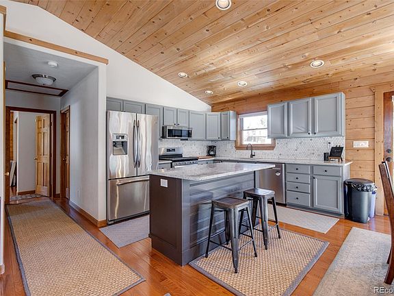 Look no further than this gorgeous mountain home in Coal Creek Canyon. Stunning views, a remodeled kitchen, and superior craftsmanship define this home sitting on well over in acre of land . The kitchen boasts granite counters, tile backsplash, stainless steel appliances, and a 5 burner gas range. The tall T&G pine accented ceiling brings in tons of warm natural light. Well laid out, with plenty of space and a walk out basement. Enjoy the perks of mountain living but with easy access, fast and reliable Mountain Broadband internet, and warm and cozy radiant heat. Beautiful, partially covered deck to sit and take in the tranquility of the area. Further amenities include a metal roof, moveable storage shed, and radon mitigation already in place. Oversized detached garage plus new asphalt driveway. This charming mountain home is move in ready!