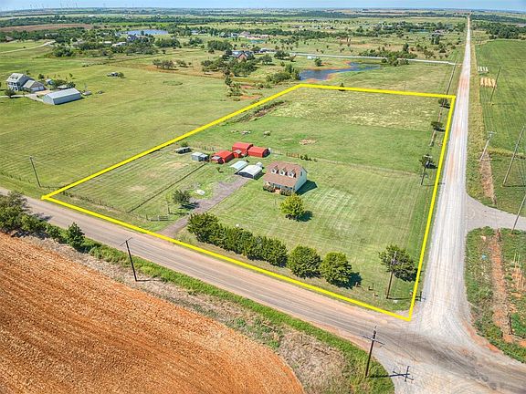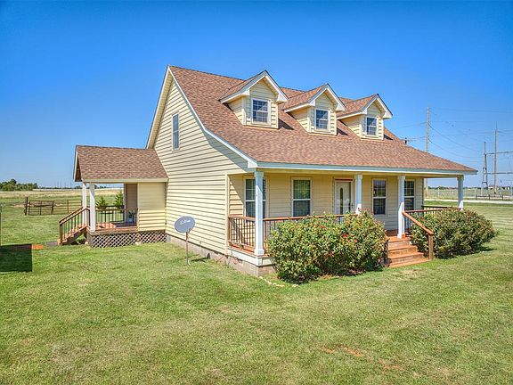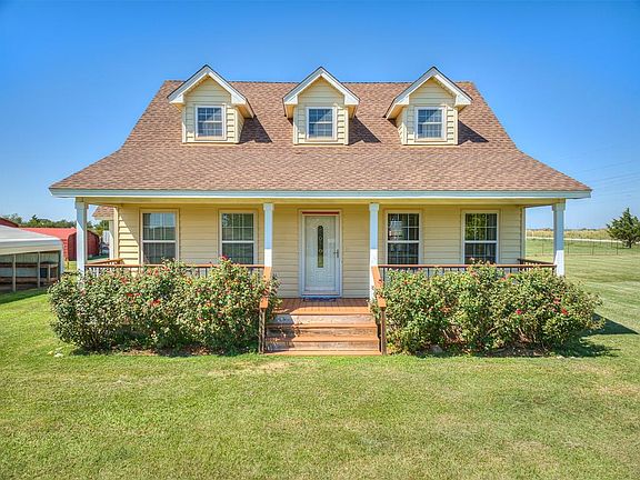 Adorable Oklahoma farmhouse on 5 acres (mol) of peaceful property. Enjoy relaxing on the wide front porch or riding horses in the large fenced pasture. This property is a dream come true that's affordably priced and located in Cashion school district. You will have plenty of storage from the small shed perfect for garden tools - to the mid size shop that is great for a workshop or bigger storage - or the large barn that can easily hold a tractor or mixed size equipment - and finally bring those chickens for the large coop surrounded by fencing to keep them in. Hunker down from those scary storms in your own large storm shelter. The property is mostly fenced, has an asphalt driveway & charming tree lined front edge providing extra privacy. Relax in your rocking chairs while enjoying the country life on the wide front porch or fire up the grill on the covered side porch. Inside you will love the light neutral colors and newer flooring. The layout is open from the living to the dining area both providing great views of the front & back of the property. From the dining area you can enjoy conversations with the cook in the galley style kitchen which also boasts views of the back property. Your guests will enjoy the conveniently placed powder bath & you will love the large primary suite, both on the bottom floor. Upstairs are 2 oversized bedrooms with wide closets & easy access to the attic storage areas. In between you will love the large full bathroom with lots of storage space. Some details of the home include but are not limited to: HVAC replaced in 1/23 w/ 10 yr warranty, wiring to well pump & pressure tank replaced in 8/22, wiring to septic in 8/22, windows w/ tilting feature & lifetime transferrable warranty in 2/10, carpet replaced in 2022.