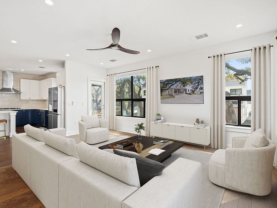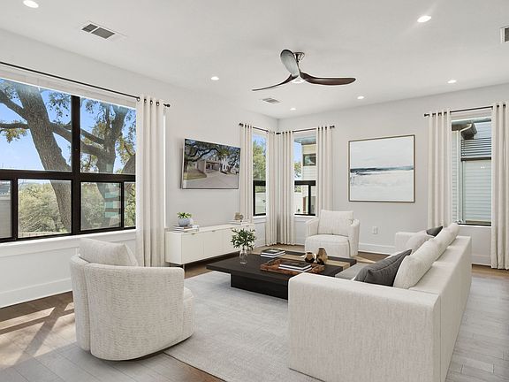 Welcome to this luxurious 3 bedroom, 3.5 bath retreat in the vibrant 78704 zip code of Austin! Step inside and experience sophisticated modern luxury combined with timeless comfort. Be impressed by vaulted ceilings, energy-efficient features, and gleaming quartz countertops that pair perfectly with the stainless steel appliances in the kitchen. Retreat to the upstairs primary bedroom featuring high vaulted ceilings and an ensuite bathroom that includes a double sink, soaker tub, and a large walk-in shower with rain showerhead. Beside it lies another room that would make an excellent guest suite or nursery. A second living area downstairs provides even more flexible space for an in-home office, game room, or media room. With two secondary bedrooms boasting access to their own full bathrooms you won't lack for space. Outside awaits an expansive patio nestled between mature oaks - ideal for outdoor dining and lounging while taking in the canopy of trees above you. Energy efficiency was top of mind during construction: concrete & wood construction, full house foam insulation, tankless water heater, 100% LED canned lights and low E windows - no detail has been overlooked! Enjoy being just 2 miles from downtown Austin and minutes from legendary spots like Loro, Uchi, Broken Spoke & Terry Black's BBQ - this home has it all! Don't wait; this incredible opportunity won't last long!