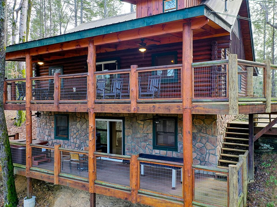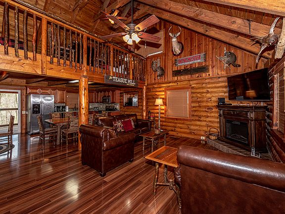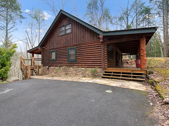 3 story Beautiful Log Cabin w/ Projected GROSS INCOME of $70,000 - $75,000!! Smoky Bear lodge sits on 1.99 acres w/ wooded privacy, but is right off the parkway & only 12 min from Downtown Gatlinburg. This Cozy Cabin has 3 bedrooms/3.5 baths & sleeps up to 14. The large front porch leads to a stone patio w/ wood burning fireplace. There are 2 very large decks off the back including a hot tub & pool table. The Very top floor has 2 double beds & a bedroom w/ a King Bed & Bath. The main floor has living room-dining room-kitchen-half bath-large bedroom w/ King bed & Large bath. Downstairs has bonus room w/ a small kitchen-couches-bunk beds-arcade games-3rd bedroom & bath. EVERYTHING CONVEYS! All furniture is top quality solid wood.