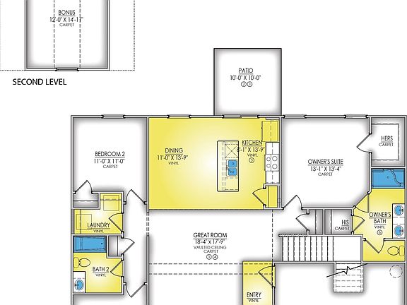 [] Under Construction, No HOA or DEED Restrictions. .52 acre homesite, The Dillon II is a single level home with a BONUS featuring large great room with vaulted ceiling, spacious kitchen with a eat up bar top. Owner's suite with raised vanity and double sinks, walk in shower. 2 additional bedrooms on the main floor. Large BONUS room upstairs. Square footage is approximate and not guaranteed. Buyers is responsible for verification. Pricing, features, terms & availability are subject to change without notice or obligation. Photos are for illustrative purposes only and may be of similar house built elsewhere.