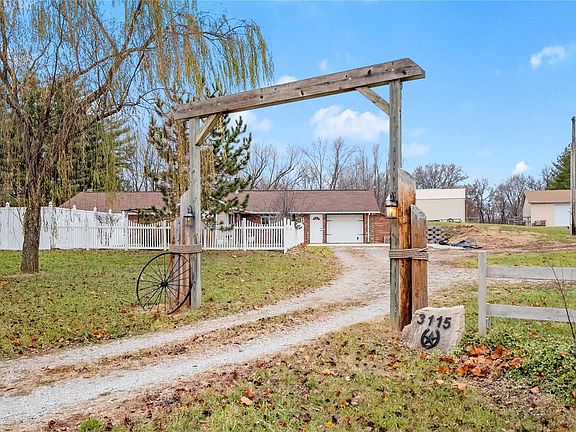 This charming Berm home, nestled on 5.88 acres, underwent extensive renovations in 2006, transforming it from a small 5-bedroom house into a spacious 2-bedroom, 1.5-bathroom retreat. The heart of the home features an open concept w/a well-appointed kitchen, dining area, & living room, complete w/a fireplace, creating a cozy ambiance. One of the highlights of this property is the inviting sunroom, offering picturesque views of the 16 x 32 saltwater pool. The spacious master bedroom boasts a unique touch with pocket doors leading to a generous 10x10 walk-in closet. Adjacent to the closet is a luxurious master bathroom suite, featuring a beautiful walk-in shower, separate his-and-her vanities, upper storage cabinetry, a vaulted ceiling w/rope lighting, & skylights for natural illumination. For those w/hobbies or horse interests, a detached 30x40 garage & a 30x30 barn await your use. This home combines the serenity of rural living w/modern comforts, making it a truly exceptional property! Additional Rooms: Sun Room