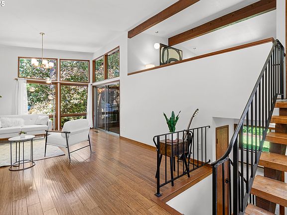 NW Contemporary Retreat in Willamette Heights. Experience the natural tranquility in this architecturally designed home tucked off a private road and backing onto Forest Park. Set on a serene 0.35-acre lot and lovingly maintained by its only second owner since being built, this residence welcomes you with a Zen-like entry that flows into a light-filled living room featuring tall ceilings, exposed beams, a wall of windows, a modern fireplace, and a wet bar. The open kitchen, complete with a gas range and skylight, flows seamlessly into the dining area with a built-in hutch perfect dishes and glassware. Upstairs, the primary suite is outfitted with plush new carpeting, an updated spa-like bathroom, and a private balcony overlooking lush green space. Downstairs hosts two additional bedrooms and a full guest bathroom. Step outside onto a spacious deck equipped with a hot tub that leads to a beautifully landscaped backyard—perfect for quiet mornings or intimate gatherings. The two-car garage has a wall of cabinets in the back for extra storage needs. Conveniently located with easy access to NW 23rd’s vibrant restaurants and boutique shopping, yet embraced by nature, this home offers the best Portland lifestyle. See our virtual tour links for more information! [Home Energy Score = 1. HES Report at https://rpt.greenbuildingregistry.com/hes/OR10237965]
