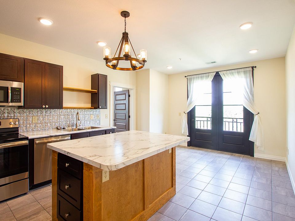 This is a European-inspired 2-bedroom flat. The unique floorplan includes a master bedroom with attached bath, walk-in closets in both bedrooms, and many windows for plenty of natural light. The kitchen features stainless steel appliances, ample cabinetry and storage space, and beautiful travertine stone tile flooring which extends into the living area. You'll enjoy a small Juliet balcony off the living room. Pet deposit and rent required. Owner pays for water, renter pays for electric.