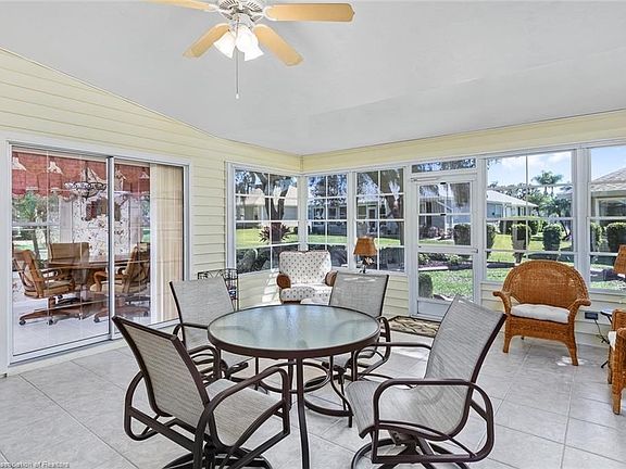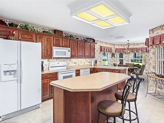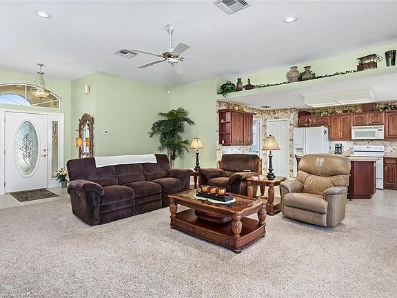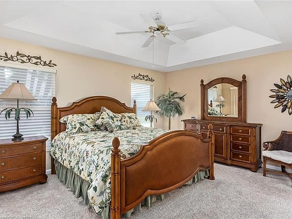 Located on an oversized cul-de-sac lot, this lovely 3 Bedroom/2 Bath home is perfect for someone who wants no work; just bring golf clubs! Originally a model, this fully FURNISHED home has many nice features to enjoy...starting with the beautifully landscaped yard, painted driveway, 2 car garage with Skeeter Beeter & separate golf cart garage, plus a 2018 Roof. Enter through the custom beveled doors to find high ceilings, updated paint colors and newer tile & carpeting. The huge kitchen comes with plenty of cherry cabinets, newer appliances, built-in desk, and a large island; which is completely open to the spacious great room. There are two expansive bedrooms, each with its own bath, for you and your guests, plus a third bedroom, which would also serve nicely as your office. And lets not forget the gorgeous four paneled beveled glass sliding doors, which lead to the 17x18 tiled lanai; perfect for your morning coffee or your evening cocktail.