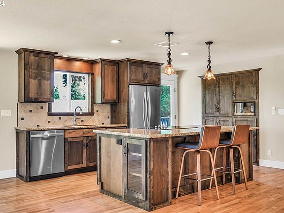 Step inside this open floor plan that has been thoughtfully updated with stunning millwork, wood floors and gourmet kitchen boasting black walnut cabinetry highlighted with granite countertops and stainless appliances. The living room is elegantly appointed with a wood burning fireplace and black walnut mantel. Perfectly situated on a corner lot with abundant natural light, enjoy northerly filtered views of the Willamette Valley. Great separation of space with lower-level family room and 4th bedroom with separate access. A sprawling deck punctuates the outdoor living space affording the perfect venue for warm weather entertaining. Plentiful parking in the garage and carport. Home is equipped with a ductless heat- pump to reprieve from the heat of Summer.