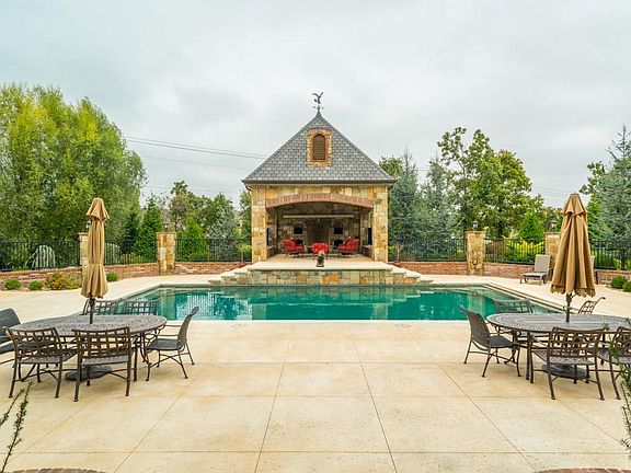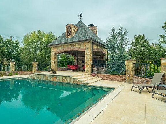 Breathtaking French Country! Elegant archways, soaring high ceilings, dramatic interior, beautiful hardwood floors, open floor plan, many windows, wonderful views, gourmet kitchen, granite, islands, commercial gas stove, butler's pantry, impressive stone fireplace w/ large hearth, main level master suite has sitting area w/fireplace. Walkout basement includes 2nd kitchen open to living area w/fireplace, theater room, wrought iron balcony w/ brick archways, overlooks impressive new in-ground pool & outdoor living space.