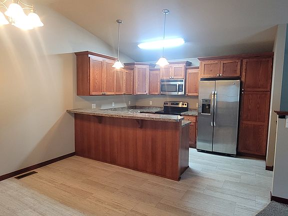 Amazing 4 bed | 2 bath home offers an attached double garage. Upon entry you will be greeted by a split foyer accessing two levels. On the main level you will find the kitchen, dining and living room in an open layout with vaulted ceilings. The kitchen is fully equipped with stainless steel refrigerator, stove, overhead microwave and a dishwasher. Your primary and guest bedroom are also on the main level. The fully finished lower level will lead you through an additional family room to the walk out patio while containing two of the bedrooms, laundry with storage and a bathroom. Located in a planned community offering walking paths, parks and picnic areas making this an ideal family home in NE Minot. Pet Friendlly upon approval, $500 per pet deposit | $50 per pet monthly fee.