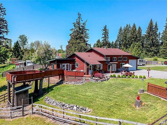 Custom pride of ownership home on acreage with breathtaking views! Master on main with loft. 2 addl rooms upstairs. Craftsman attention to detail on interior finishes. Granite, SS appliances, river rock surrounding wood stove, ductless hp-mini split, heated ceramic tile bathroom floors, sun rm and sauna. Newer roof and exterior stain. An amazing deck! Shy 2 acres fully fenced and set up for horses with very nice stalls opening up to pasture. Container can stay or go. Easy commute to JBLM.