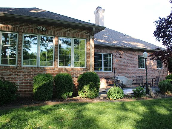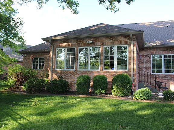 Carefree luxury living in this gated community. All brick, energy efficient 2x6 construction. This lot offers a serene setting, thanks to views of the neighboring pond & mature trees. Open floor plan has spacious rooms plus each bedroom has en suite bath! Huge basement is wide open & clean. Sunroom floor is exposed brick or cobblestone. Warm decor, new carpet in BR's. Association takes care of exterior grounds maintenance, garbage, common areas, sprinkler.