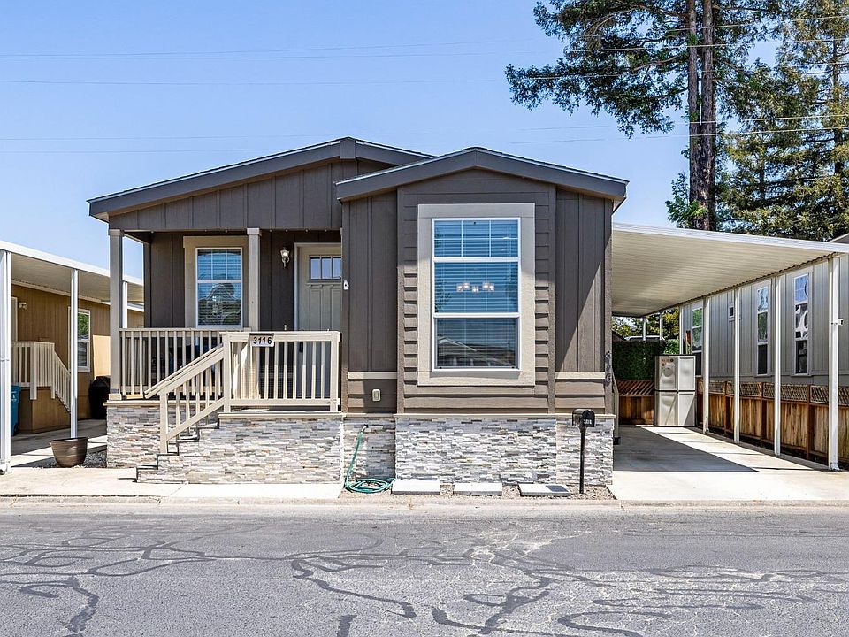 Located in the desirable all age Coddingtown Estates mobile home park, this 3 bedroom 2 bathroom home built in 2019 is like new. Light and bright throughout with a great open floor-plan featuring newer carpet & paint. The modern kitchen/dining nook boast grey cabinets with stunning granite counters and pendant lighting. The deep carport adds enough room for your cars, pets, and BBQing (a big plus) Easy access to shopping, restaurants and more. A beautiful home that is definitely move in ready!