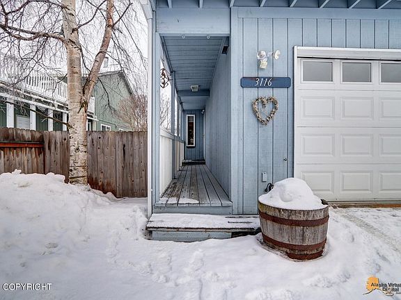 Wonderful Eastside ZLL only steps from Baxter Bog Park and trails. Skylights and open vaulted ceilings provide tons of natural light to both the lower living area and the upper Family Room. Master BR on lower level with a Quiet Rock wall for privacy from adjoining neighbors. Fenced backyard with shed and newer deck, and a huge deck over the garage with a greenhouse and views of the Chugach Range.