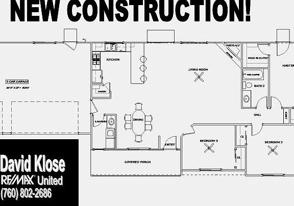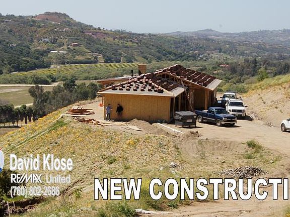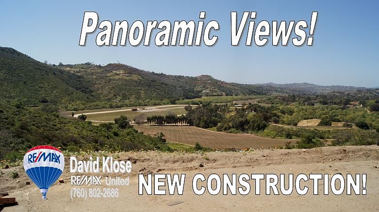 Exclusive Listing - David Klose - RE/MAX United - 760-802-2686 * See 3-D Matterport Virtual Tour * AMAZING PANORAMIC VIEWS! New Construction Single Story on 2.9 acres. Quality built home with custom finishes including Quartz counters, wood sills on windows, jetted tub in master bath & more. Purchase now and choose some of the finishes. Open floor plan with a Great room. Custom 22x12 covered porch. Oversized 3-car garage! Spectacular Views to the south and southwest overlooking the hills and valley of vineyards below. Energy efficient Tankless Hot Water Heater * The lot has space for R/V Parking, and additional parking, place for a shop if one desires, and plenty of places to plant grape vines, fruit trees and more. Photos of the completed home are for example purposes and may include optional upgrades. Built by Pence Construction Co. Estimated completion June 2017.