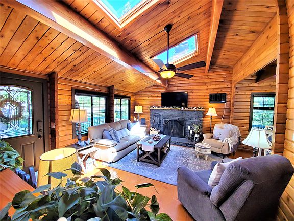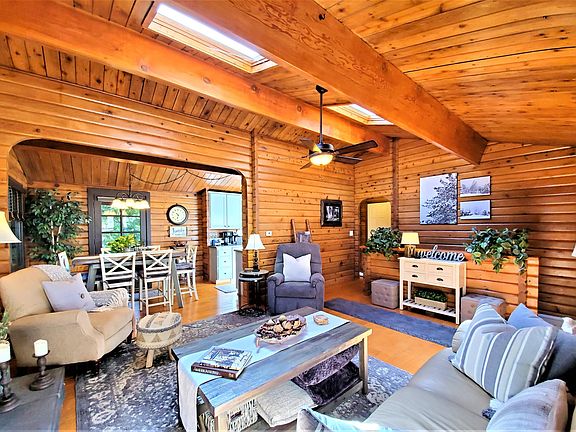 Almost level entry on a huge level corner lot with few neighbors, the SkyView home is built from tongue & groove solid wood logs, exterior & interior, breathing the comfort & style of the perfect mountain house. The entry level opens to a large all wood living room, with a rock fireplace, spacious formal dining & kitchen. Brightness pours in thru the tall ceilings & skylights in both living & kitchen areas.Hardwood floors & conformity makes these areas fully functional. French style windows all double pane open wide to the gorgeous manicured landscape of the yards. Wrap around decks upstairs & covered deck downstairs. The kitchen looks like new with custom cabinets & countertops. A dream to cook here while watching the jays & squirrels on the deck. There is a large bedroom & bathroom on the entry level. A wide staircase leads to the lower floor with its own deck. There are 2 additional sprawling bedrooms, jack & jill bath & a perfect build up or storage area w/ extra fridge, laundry & sheltered utilities equipment. Everything is spotless & functional. Please watch the virtual video to comprehend some of it! A few miles drive takes you to Snow Valley! At this price it will not last