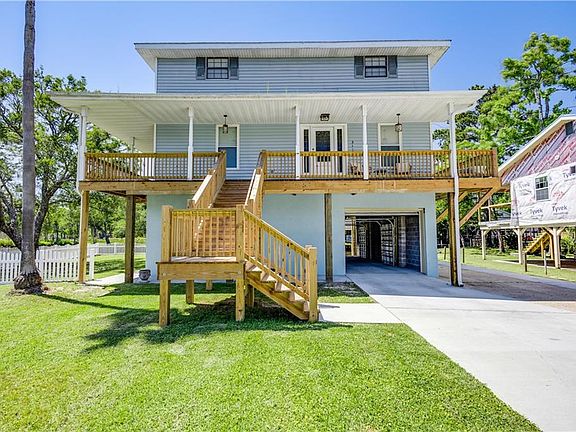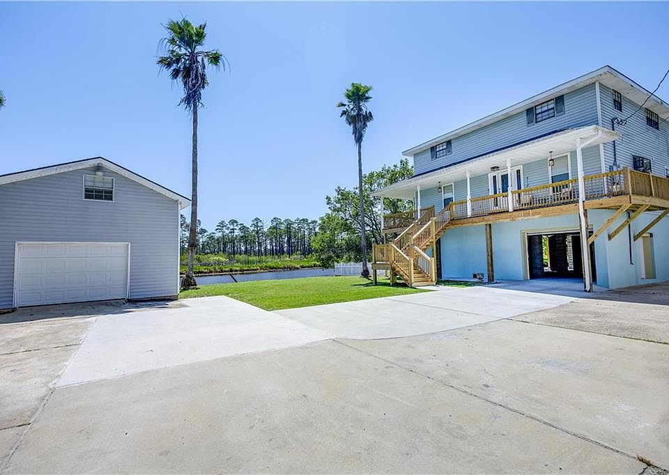 Incredible raised waterfront stunner on corner lot PERFECT for entertaining with TONS of amenities--2022 roof, all new raised foundation, new floors, renovated bathrooms, and so much more! Boating enthusiasts will revel in the private boat launch, a gateway to navigable waters. Inside, the house is bathed and features new floors, renovated bathrooms, and a cheerful atmosphere throughout. A wrap-around porch beckons you to immerse yourself in the picturesque views while the large screened-in bonus patio area presents an ideal spot to entertain guests amidst the lush surroundings. The house has recently been raised in 2022, offering TONS of shaded bonus space for crawfish boils or BBQs, and also ensuring added peace of mind and protection against any potential flooding, as well as unbeatable insurance in today's market--flood is only $1200! On top of this, the detached garage is fitted with an upstairs bedroom and full bathroom that could be perfectly utilized as a guest suite! 3117 Bayouview Place is more than just a property; it's an embodiment of waterfront living at its finest. Whether you seek a serene retreat or an adventurous escape, this home has it all. Don't miss this rare opportunity to claim your piece of paradise. Schedule a viewing today and experience the allure of this waterfront oasis firsthand! (make sure to watch video walkthrough as well)