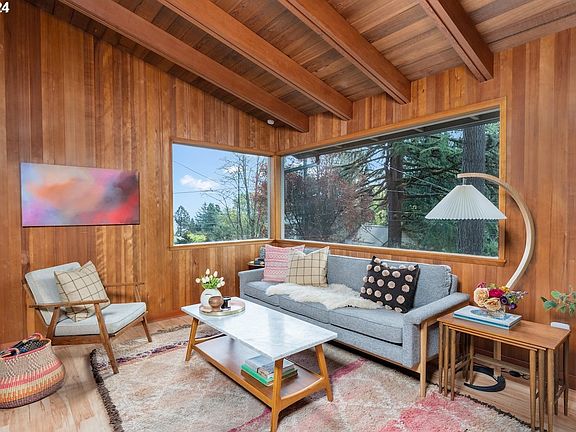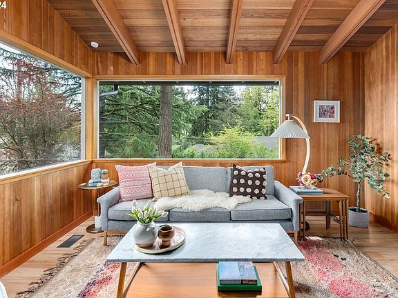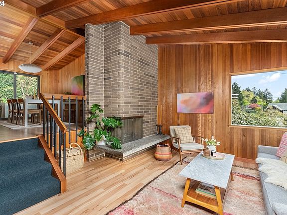 This beautiful Kings Heights Mid-Century Modern is all about location, views and unique architectural details. | Location: House sits up off the street on a rare cul-de-sac with convenient access to the Wildwood Trail, Hillside Park, Northwest 23rd shopping district and excellent schools (Chapman Elementary School, West Sylvan Middle School, and Lincoln High School). | Views: Enjoy views of downtown and the Cascade mountain range from your living room, front deck or upper yard. | Architectural details: Designed by architect Ralph Panhorst, the open-plan living and dining rooms boast Cedar lined walls and vaulted ceilings with exposed beams, and a wood fireplace. On the entry level, choose between the cozy living room as a perfect place to wind down after a busy day, or relax in the large, sun-drenched family room with its sliding glass door to the balcony. Step up to the main level with new cork floors throughout, and enter the dining room with a new sliding door to the private patio. | Next to the dining room is the kitchen with Fisher & Paykel fridge, GE Café induction oven, and a corner breakfast nook with city views. Behind the kitchen is the laundry room with LG washer & dryer, sink, and a new ProVia back door leading to the patio and upper yard. The main floor includes a spacious primary suite with two closets; a bathroom with dual sinks, shower and tub; a second bedroom with a walk-in closet; and a powder room. On the lower level, you will find a third bedroom, a second full bathroom, a big storage room, and direct access to the 2-car garage. | Recent updates: Pella Impervia fiberglass windows and sliding doors, Herman Miller lighting, fresh interior and exterior paint, and new cork flooring on the main floor. | Outside space: The 0.25 acre lot features landscape design by Pistils Nursery, fenced yard, and includes four zones: front yard deck, balcony, backyard patio, and an upper level yard.