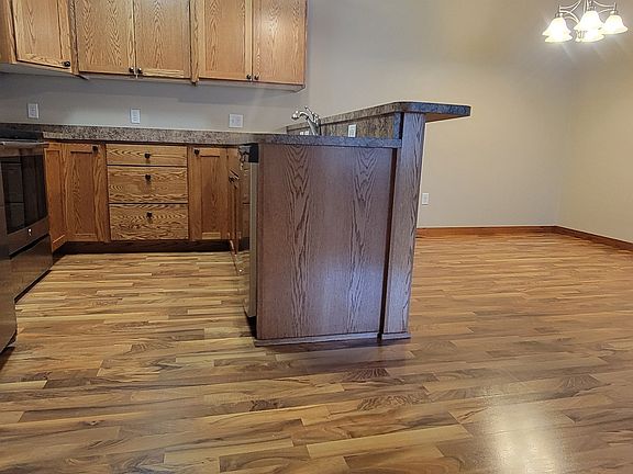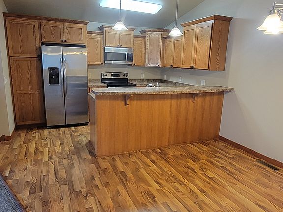 Amazing 4 bed | 2 bath home offers an attached double garage. Upon entry you will be greeted by a split foyer accessing two levels. On the main level you will find the kitchen, dining and living room in an open layout with vaulted ceilings. The kitchen is fully equipped with stainless steel refrigerator, stove, overhead microwave and a dishwasher. Your primary and guest bedroom are on the main level. The fully finished lower level will lead you through an additional family room to the walk out patio while containing two of the bedrooms, laundry with storage and a bathroom. Located in a planned community offering walking paths, parks and picnic areas making this an ideal home in NE Minot. Pet Friendlly upon approval, $500 per pet deposit | $50 per pet monthly fee.