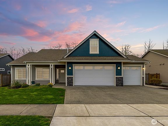 Rare Newer Rambler on Greenspace, With a 3 Car Garage ! Here's the one you have been waiting for.... Lovely Open, vaulted & spacious level entry home. Huge bonus room upstairs. Built in 2019, this Pine Creek location is perfection. Walk to parks, covered pickleball & covered tennis courts, bus stop. Appliances stay. Low HOA dues. ALL of the counters are stone. Stainless appliances in the kitchen, huge island and room for display or sidebar. Watch the birds in the back from this well laid out home...Covered patios at front and rear. You are near to everything. Amtrak, The San Juans, Canada. Leaf guards, gas for BBQ at back. Fenced and ready for pets. It's time to make your move to the Lovely Skagit Valley ! PRE-INSPECTED & Move-In READY