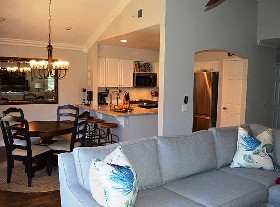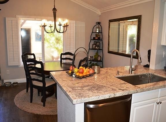 Completely remodeled single story in Tanglewood. End unit with large grassy park out the front door. Super quiet location! Over 30k in recent upgrades include;distressed wood laminate floors throughout, 5 1/2" baseboards, fresh neutral paint, crown molding, ceiling fan, recessed lighting, raised panel doors, gorgeous slab granite counters in the kitchen w/subway tile back splash & GE SS appliances, mstr bathroom vanity w/granite, subway tile shower, mirrored wardrobe, plantation shutters & more!!