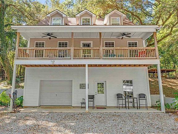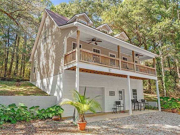 Surrounded by trees, lively elephant ears, and the occasional visit from a passing deer, this beautifully refreshed home in the heart of Spanish Fort invites you in with a sense of peace, space, and warmth. The exterior, railing, and basement have been freshly painted, giving the home a clean and updated appearance. The home features a full-length covered front porch overlooking the wooded setting, along with a lower-level patio that extends the outdoor living space. Inside, a newly added window fills the living room with natural light, highlighting the open feel of the main level. Just beyond, the dining area and kitchen are brought to life with whitewashed tongue-and-groove ceilings that add rustic charm to everyday moments. The kitchen includes stainless steel appliances and is positioned just off the dining area for everyday ease and functionality. The layout offers comfort and privacy, with the primary suite located on the main level and two more bedrooms and a full bath quietly tucked upstairs. Throughout the home, luxury vinyl plank flooring runs underfoot, with soft carpet in the bedrooms. Downstairs, the basement extends your living potential with approximately 750 square feet of additional space that could be transformed for added space. The wooded lot provides not only privacy but freedom, with no HOA and plenty of room for boats, trailers, or extra parking. Two covered parking areas offer additional space to protect vehicles or recreational equipment year-round. Located in a peaceful county pocket within the Spanish Fort area, this home is just minutes from shopping, dining, schools, and medical care, with quick access to Mobile, Pensacola, and the white sand beaches of the Gulf Coast. The seller also owns a separate 4-acre parcel located two lots down, listed separately. Buyer to verify all information during due diligence. Don’t let this one pass you by. Call your favorite agent today to schedule a private showing.
