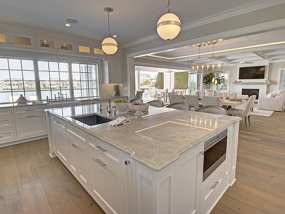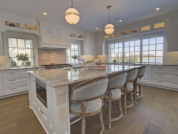 Winfield Developers DOES IT AGAIN! Extraordinary, brand new BAYFRONT home on an oversized 80 foot lot that is sure to be the most talked about new sale home of 2018. Mark Asher, Architect designed this traditional floor plan with 6 generous bedrooms, all with ensuite baths and fabulous water views. The timeless architecture features a full cedar shake exterior. From the minute you enter through the gorgeous mahogany front door into the wide, two story foyer, all you see is the bay. The first floor great room features a retractable wall of glass allowing a seamless transition from interior luxury to outdoor covered porches and a fabulous oversized heated pool with sun shelf, expansive spa and marble pool decking spanning the width of the lot. There are two outside showers, pool bath, new vinyl bulkheading, ramp with stainless steel handrails, floating dock and two deep water boat slips. The bay has recently been dredged so no worries about water depth. The lot position allows the best of both worlds...protected harbor and spectacular open water and sunset views. The living room with fireplace and custom mantle has immediate access to a fabulous wet bar with beautiful cabinets, stone top, sensational floor to ceiling custom wine chiller with glass doors, ice machine and two refrigerator drawers. The kitchen will simply take your breath away offering very premium custom cabinets, Wolf range, Subzero refrigerator, 2 Bosch dishwashers, 2 large sinks, plumbed Miele coffee service, hidden pantry with custom cabinet doors and Taj Mahal Quartzite countertops that are works of art. The waterfront dining area can comfortably seat a large group. The large first floor additional family room has a custom barn door, built-ins, surround sound and access to a covered porch with water views. The first floor also has a powder room, tucked away office for privacy, wonderful laundry room with 2 washers and dryers and a beach entry room. The second floor has vaulted ceilings throughout, charming bunk room for kids and expansive waterfront covered porches. The bayfront master bedroom has a private deck, fireplace, large custom walk-in closet, fridge drawers and the most sensational master bath with twin sinks looking out to the bay, soaking tub, oversized shower with separate steam room and extra laundry. Other amenities include 3 stop elevator, extensive custom mill work throughout, gorgeous wide plank, engineered oak floors throughout, distributed audio, gorgeous high end lighting on a beautifully landscaped lot with landscape lighting. Best of all, the home is sold fabulously furnished including premium outdoor furniture by the Ford Design Studio. Home is easy to show to qualified prospects.