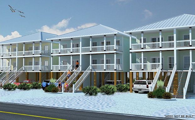 Located just 2 1/2 blocks from Hwy 59, public beach access, lots of restaurants & shops; all within walking distance. The design will consist of 4 buildings 2 units each; a total of 8 units, constructed in a raised beach 2 story design with hardy board siding, metal roof & covered parking. Complex will provide a big resort feel in a low density complex The real Beach Life. *Need Not Be Built