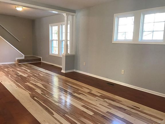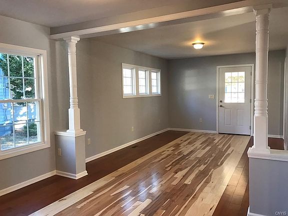 Completely renovated 2 bedroom Cape in North Syracuse! Custom finishes throughout from two-tone wood flooring, ornamental pillars, built-in organizers closet organizers, and so much more! The kitchen has been fully updated with new appliances, new counters, new sink, new cabinetry juxtaposed by unique black molding, and beautiful pendant lighting. Bonus room off the living room connects to updated full bath and could be used as an office/additional bedroom. Two bedrooms upstairs with brand new lighting, carpet, and custom closet organizers plus another fully updated full bath. New mechanicals as well; brand new furnace and 40 gallon hot water heater. If that wasn't enough, there is a full basement for storage and a deep lot for outdoor entertaining. What more could you ask for? Call today!
