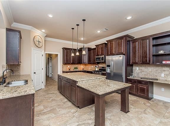 Stunning 4BR/3BTH open floor plan! Well-lit expansive living room w/ gleaming wood floors & beautiful built-ins framing a gas fireplace. Adjoining gourmet kitchen w/ sweeping center island w/ step down seating, granite counters, abundant cabinet space, SS appliances, & travertine backsplash. Lovely master suite w/ ensuite bathroom offering double vanity, spa tub, separate shower, & incredible closet space. Roomy additional bedrooms, sizable laundry room, & mudroom. Oversized patio overlooking greenspace.