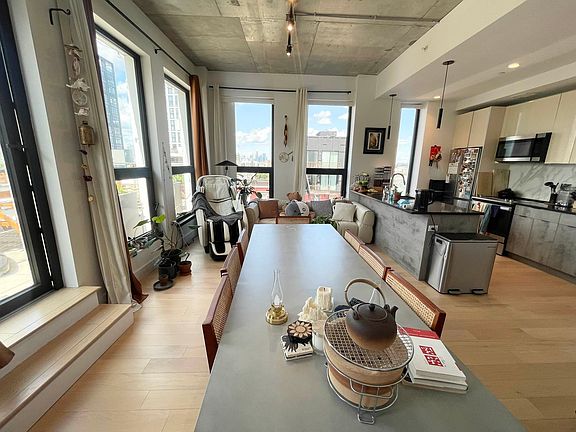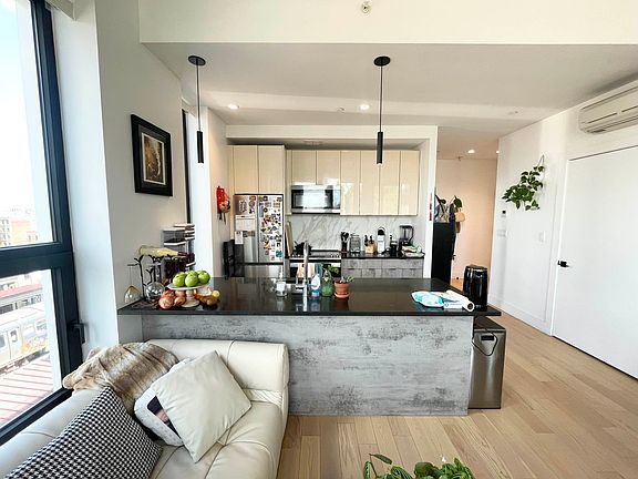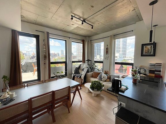 Massive Private Terrace with Breathtaking City Views! Discover the epitome of modern urban living in this stunning apartment- featuring: Expansive private terrace with panoramic city views, including a unique vantage point over the subway tracks. -White oak hardwood floors throughout, enhancing the sleek, contemporary feel. -11' exposed concrete ceilings for a spacious, industrial-chic ambiance. -Imported triple-paned tilt-and-turn sound-engineered windows that flood the space with natural light while ensuring whisper-quiet tranquility -Washer/dryer conveniently located in-unit. Gourmet Kitchen: -GE stainless steel appliances -Dramatic drip pendant lighting creating a warm and inviting atmosphere. -Black Caesarstone countertops paired with white melamine cabinetry for a striking, modern look. Luxurious Bathroom: Polished chrome fixtures and full white subway tiled walls. Deep soaking tub and rainfall steam shower for a spa-like experience. Custom mirrored vanities with ample storage space. Building Amenities: -Virtual doorman providing convenience and security. -Elevator access and individual bicycle storage for ease and efficiency. -Private onsite parking with electrical charging ports. -Landscaped common roof deck with spectacular views of the Manhattan skyline and the Williamsburg Bridge. Prime Location: Just seconds away from the J, M, and Z trains for a swift and easy commute into Manhattan. This apartment offers the perfect blend of luxury, convenience, and unparalleled views. Don't miss out on this incredible opportunity!