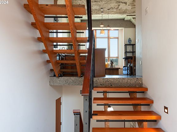 Steeped in Hood River's history and converted into the modern townhouses known as The Union Building Lofts this 1300SF, 2 Bedroom, 2 bath Columbia River view property is zoned commercial and can be used as a vacation rental. The exposed agate concrete floors on the main living area, along with the concrete ceilings and expansive north facing glass windows makes this a stylish urban retreat. The kitchen is well appointed with a center island, quartz counters, fir and laminate cabinets, and the open concept layout is great for entertaining. The primary bedroom is spacious with ample closet space and a calm and serene attached bath with a large tub and separate shower. Head up to the rooftop deck which features custom metal planters maintained by the HOA, an outdoor sink, and expansive views of the Columbia River, the Underwood hills and the city hills of downtown Hood River. The rooftop deck has North facing or South facing furniture placement options and a space to dine out of the wind. This townhome is conveniently located to everything the city of Hood River has to offer for dining and entertainment, as well as, a short distance to the waterfront activities and dining experiences. Call your favorite real estate agent for a showing.