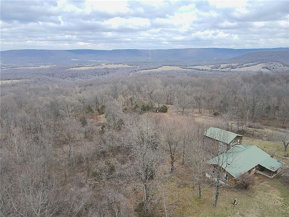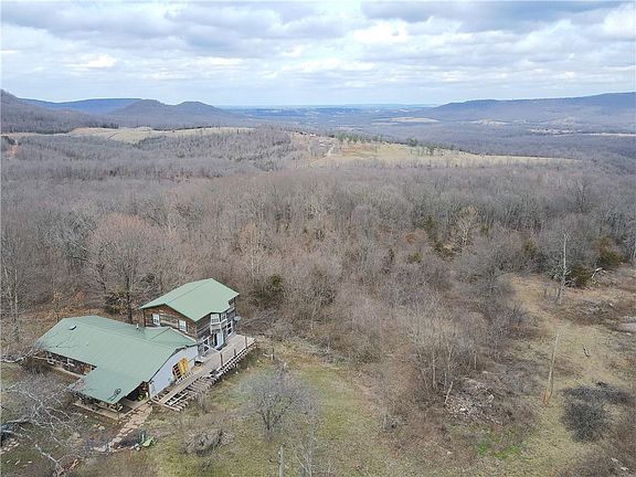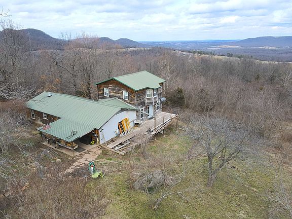 This unique 46+/- acre Ozark homestead offers a hard-to-find combination of privacy and convenience. Upon entering the property you immediately notice incredible views from the home, of both the towering mountain to the west, and the long distance view to the east. You’ll also notice the huge amount of functionality of the flat to gently sloping open area on which the home and outbuildings are positioned. Power, water, and fast internet are all ready to go, and there are three beautiful ponds within walking distance from the home. The 2400sf home lacks just a few finishes, such as some trim, paint, and decking, but is also perfectly cozy as-is! The kitchen has a ton of character, and there are 3 bedrooms and 3 baths. One of the outbuildings also has living quarters, while the other is used for storage. The acreage is gorgeous and full of wildlife, flowers, springs, giant boulders, and lots of room to hike and explore. A hike up above the bluff will yield views for miles and miles to the north and west.