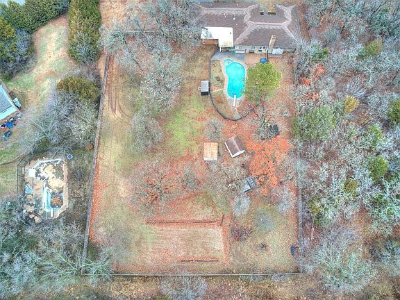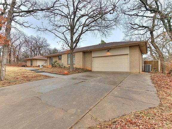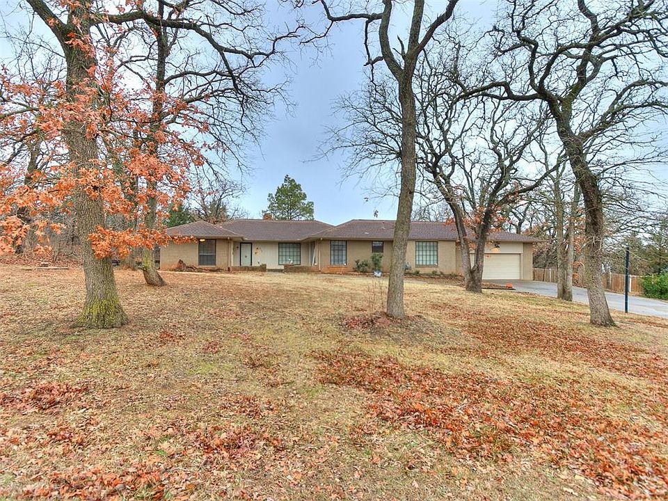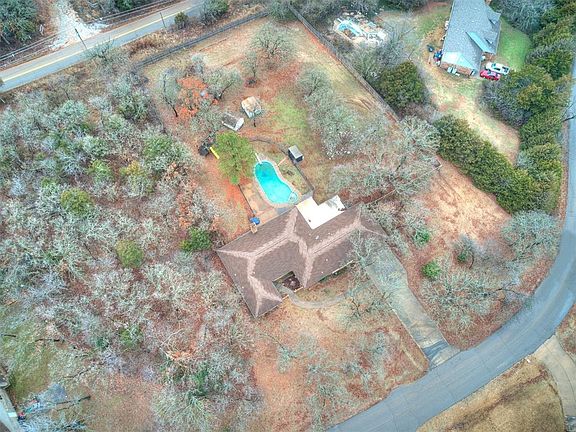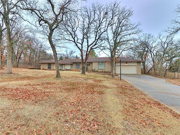 Fabulous 1+ wooded acre property with Edmond schools, Logan County taxes, and a quiet neighborhood with no HOA! Large windows throughout this one level home provide beautiful views of the gorgeous outdoor spaces, including the amazing backyard with sparkling in-ground pool and wooden deck! The spacious living area boasts high ceilings and built-ins surrounding the wood-burning fireplace. The beautiful kitchen features double ovens, JennAir cooktop, custom cabinets, and granite countertops with a breakfast bar creating a space perfect for cooking and gathering. The home has a large main bedroom with walk-in closet and en-suite bath with separate tub and shower.