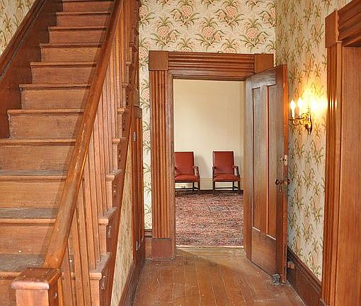 One of the best examples of Greek Revival architecture in Delphi. If you have been on the tour of the Wabash Erie Canal Museum and Park and visited Reed Case's (helped in the building of the Wabash an Erie Canal) original wooden frame house in the Park, the brochure states he moved to the house at 312 East Main Street when he became wealthy. This is that beautiful brick home! Thick walnut doors and tiered woodwork in the main parlor and throughout the home. It is for sale by owner, The ceilings downstairs are 9 feet high and upstairs they are 11 feet high. It needs a new heating system. Floors are unpainted eight inch wide tongue and groove oak boards, and a few smaller rooms upstairs have painted floors. Latches, locks, and key-hole covers made of iron and there are lovely brown marble door knobs. There is a one car garage behind the house. This house makes a wonderful home or office!