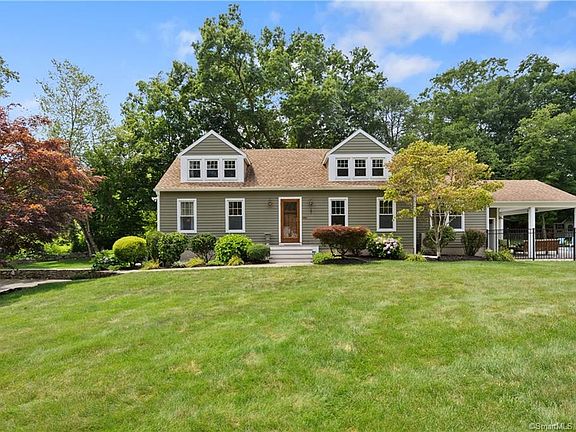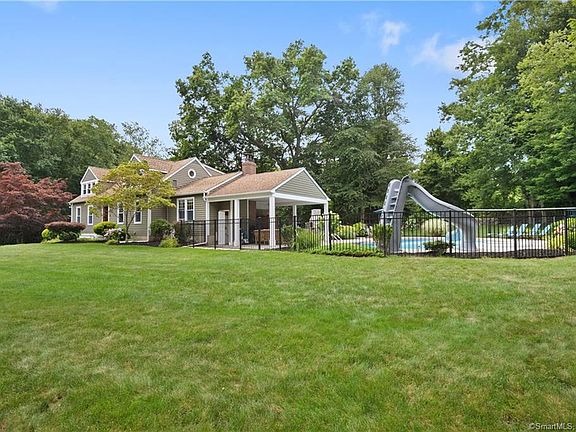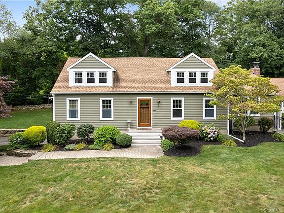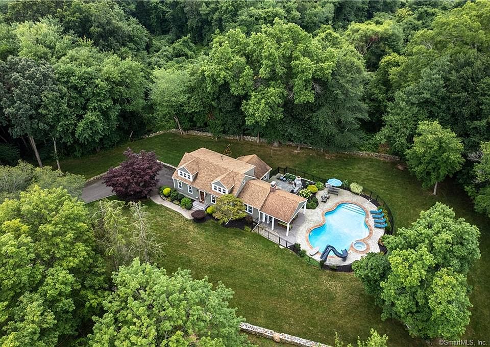 Vacation at home in this charming country Cape style home. Set back on a tranquil 1-acre lot, this home offers 3 bedrooms and 3 full baths. Open concept, light-filled main level features a first floor master bedroom with updated bath, stunning remodeled eat-in kitchen with vaulted ceiling, granite counter tops, center island and stainless steel BOSCHE appliances. The kitchen leads to a family room boasting cathedral ceiling with shiplap trim, wide-plank wood flooring, an impressive stone, floor-to-ceiling fireplace with wood-burning insert, perfect for those colder New England months. The living room off the front foyer accessed via glass pocket doors provides a quiet space for those looking for a home office or den. Plus, there's a second full bath off the foyer. Two generous size bedrooms and a full bath are found on the second level. The lower level offers an additional 640 SF of finished space, laundry area and access to a 2-car garage. An entertainer's delight with fabulous indoor and outdoor spaces with slider leading onto an oversized, fenced-in patio with heated, salt water pool, built-in hot tub, stone fireplace, outdoor shower & toilet and a covered porch overlooking a gorgeous yard surrounded by stone walls. The grounds are spectacular your own private paradise. Desirable location, close to town, minutes to the historic town green, restaurants, shops and commuter routes. A home such as this only comes around once in a while, plan a visit! In addition, this home has hardwood floors throughout, beautiful trim work and crown molding, 4 mini split cooling/heating systems (family room and all 3 bedrooms), security system, playhouse/shed, city water.