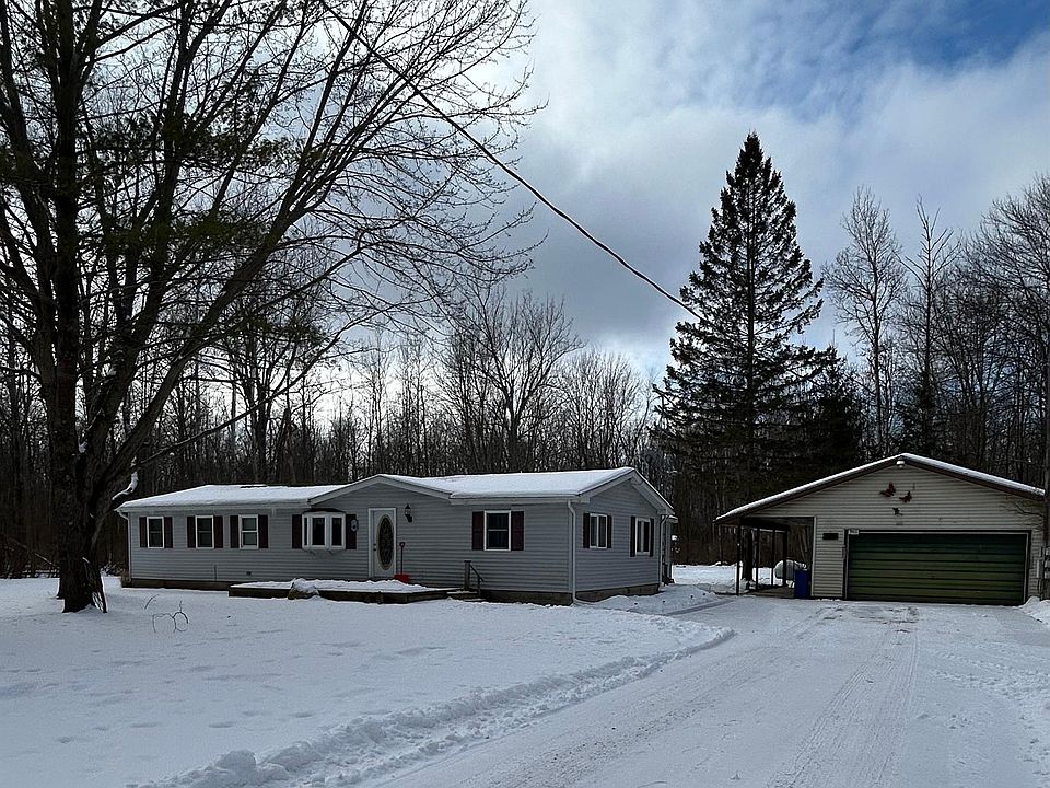 Country living at its best in this three-bedroom, two-bathroom ranch with a large unattached garage, attached lean-to, and separate storage building all situated on 3.3 acres of prime hunting land. The property features a pond and has state land just across the road. Inside you will find approximately 1800 square feet with a modern kitchen featuring oak cabinets made by Amish craftsmen. Additionally indoors, you can expect to see a large living room and formal dining room. There is a beautiful large family room with a gas fireplace. Of the three good-sized bedrooms, one is a master bedroom with an attached full bath and separate utility room. Take time to look at this home and property as we know it will not last long.