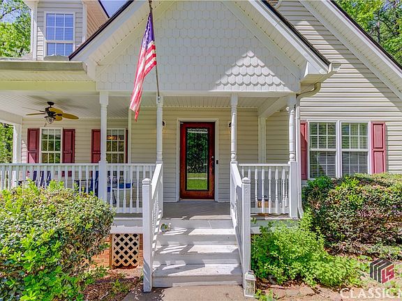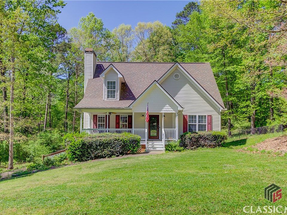 This sweet cottage-style home is as cute as a button and ready for you to call it home! The rocking chair front porch is the perfect spot to sip sweet tea and enjoy the peaceful surroundings. Lovely hardwood flooring graces the main living areas including the fireside family room & dining room combination. The kitchen boasts white cabinetry, plenty of storage and an eat-in area for casual meals. The Owner's Suite on the main will become your tranquil retreat from everyday life. Featuring a spacious en suite bath with soaking tub, large shower and dual vanities. The laundry room and convenient half bath round out the main floor. Upstairs you will find three additional guest rooms, each with ample closet space and sharing a wonderfully appointed secondary bathroom. The basement is unfinished, but stubbed for not one, but two bathrooms and provides plenty of opportunities to finish for more living space. The back deck overlooks the large, partially wooded backyard and meandering creek that runs across the back of the property. There's plenty of room for a pool, gardening and playing.