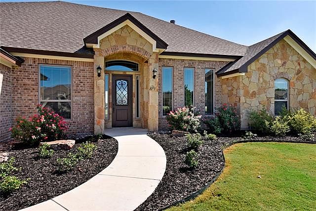 Affordable elegant country living. Bright open space with beautiful wood floors, stone fireplace, recessed lighting, crown molding for a finished look. Kitchen offers eat at island, stainless steel appliances, under & over cabinet lightening, large pantry. Exterior features all sides masonry, 3 car garage, covered patio, wrought iron fence.