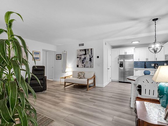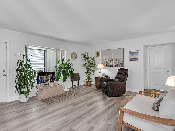 Welcome to this stunning +55 condo with 2 bedroom 1 bath where modern design meets comfort and convenience. Fully remodeled from top to bottom, this move in ready home features an open concept layout with a brand new kitchen showcasing white cabinetry, quartz countertops, stainless steel appliances, and a stylish breakfast bar. Beautiful waterproof luxury vinyl flooring flows throughout, complemented by smooth ceilings (no popcorn!). The bathroom has been tastefully updated with modern finishes, while both bedrooms offer spacious walk in closets and a linen closet for extra storage. Enjoy peaceful garden views from your private patio, upgraded with full length sliding glass doors and additional storage. A full sized washer and dryer are conveniently located in the laundry area. Major upgrades include a new roof, A/C unit, smart thermostat, and electrical panel plus full hurricane protection with accordion shutters.